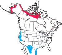 Cackling Geese are long-distance migrants, following relatively direct, traditional flight paths between their breeding grounds in the arctic and their wintering grounds in the Pacific Northwest, California, and the gulf coast of Texas. Spring migration can begin as early as late January and is prolonged by stops at traditional sites to replenish nutrients before arriving at the breeding grounds. Fall migration begins in late August and can be non-stop or interrupted. Cackling Geese may reverse migration and return to a previous stop along the route if they encounter unfavorable weather.
