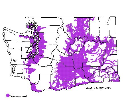 California Quail are common and widespread in Washington. They are found in shrubby areas, farmlands, residential areas, and city parks. In western Washington, they can be found in the Puget Trough south to the Willamette Valley, in the San Juan Islands, and on the Olympic Peninsula in Sequim. In eastern Washington, they can be found in most areas with water below the lower tree line. In the Blue Mountains, the species is expanding up creek and river valleys. They are absent from the vast tracts of dry wheat and from the moist river valleys in the northeast corner of the state.