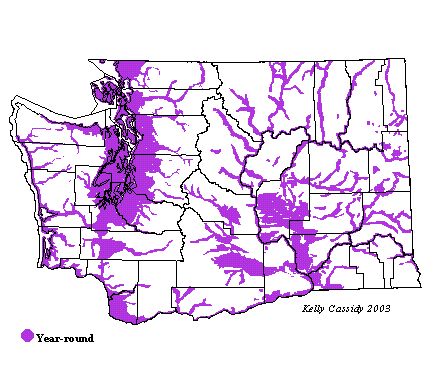 In parts of their range where food is not available in the winter, Great Blue Herons are migratory, and some may migrate to Washington from points farther north. Most of Washington's breeding population remains in the state year round. In parts of eastern Washington where the water freezes, Great Blue Heron populations concentrate along major rivers where food is available, or they hunt rodents on land.