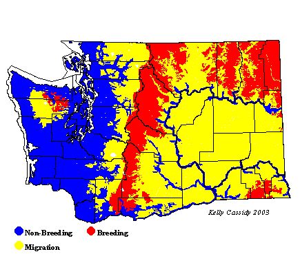 Ruby-crowned Kinglets breed in the eastern Cascades and at very high elevations just west of the Cascade crest (e.g. on Mt. Rainier.) They also breed in the Olympics. They are common in winter in the western Washington lowlands as far as the outer coast, but are uncommon in winter in eastern Washington lowlands, where they may be found in pear and apple orchards, towns, and streamside woods. During fall and spring migrations (September to October and mid-April to early May), they are conspicuous in isolated patches of trees, orchards, and other lowland areas throughout the state.