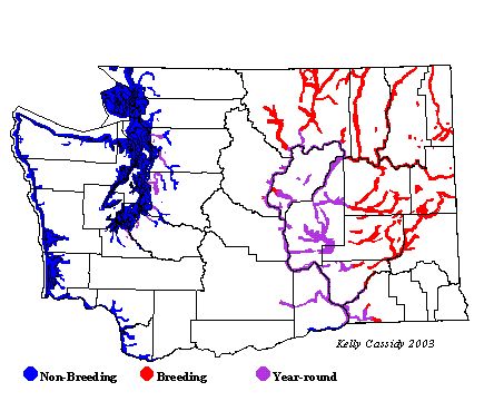 Ruddy Ducks are common in the summer at lower elevations in much of eastern Washington. Ruddy Ducks breed from the central Columbia Basin east through the Palouse and north along major river valleys in all the northern counties of eastern Washington. They are absent as a breeder west of the Columbia River in Chelan and Kittitas Counties as well as throughout most of western Yakima and Klickitat Counties. In western Washington, Ruddy Ducks breed uncommonly in the Puget Trough in King and Pierce Counties. They are abundant throughout the winter on open water. They are most common in the Strait of Juan de Fuca and Puget Sound, at major river estuaries, and locally along the Columbia River.