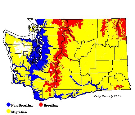 Lincoln's Sparrows are common breeders at high elevations in the northeastern corner of Washington. As migrants they are common throughout the state in appropriate habitat. Wintering birds are regular west of the Cascades, but are not typically found east of the mountains.