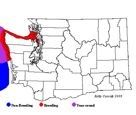 From boats, Tufted Puffins are easier to see on the breeding colonies than many other alcids, as they are active during the day and can often be seen standing in front of their nesting burrows. However, although the Tufted Puffin is one of the most abundant seabirds breeding in Washington, it is among the least frequently seen, except from boats. During winter, these puffins are seen only occasionally near land. Most of the 29 known nesting colonies in Washington are on the outer coast. Jagged Island and Alexander Island hold the largest colonies, with 7,800 and 4,000 breeding birds, respectively. The five known inland colonies are located on Protection Island, Seal and Sail Rocks, Smith Island, Colville Island, and Bare Island.